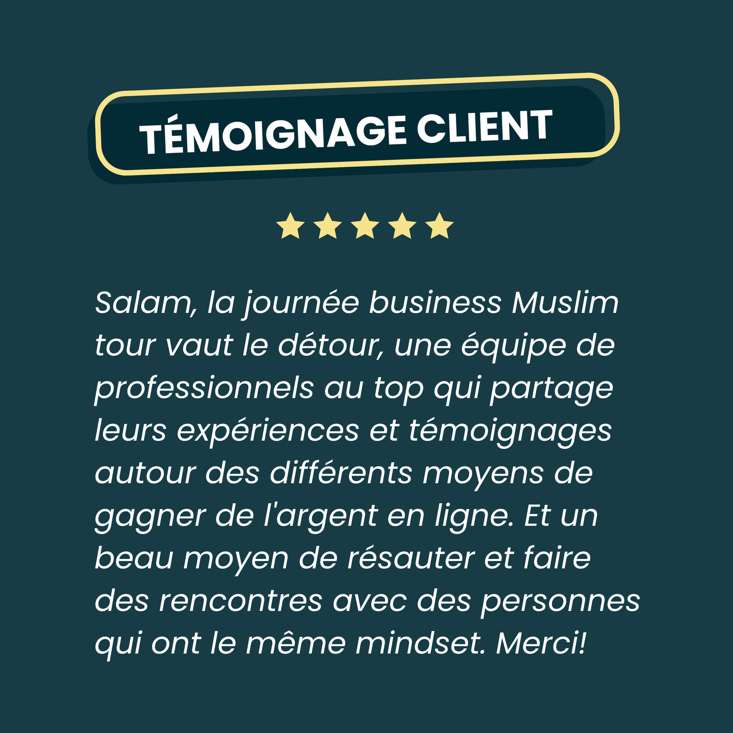 Le Muslim Business Tour est conçu pour celles et ceux qui veulent prendre leur avenir en main, bâtir un business aligné avec leurs valeurs islamiques et surtout, développer un réseau solide.